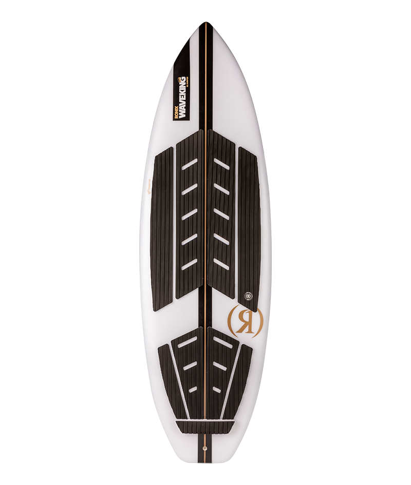The Wave King series features a test team of riders up to 300 lbs. riding either the more powerful cutback surf version or the easier-to-360 skimmer model. A smooth floaty rail and fast rockerline inspired by one of our favorite ocean surfers we have made over the years, and most importantly, a volume to keep any size waterman locked in with the wave. Made in our lightweight Flyweight construction with our super easy-to-use button fin system and three locked-in floating fins for a stable, mega-fast formidable new surfer. We have also had a lot of fun riding this shape without a boat in standing wave machines. This Wave King comes with a leash plug so you can ride your local river swell.
