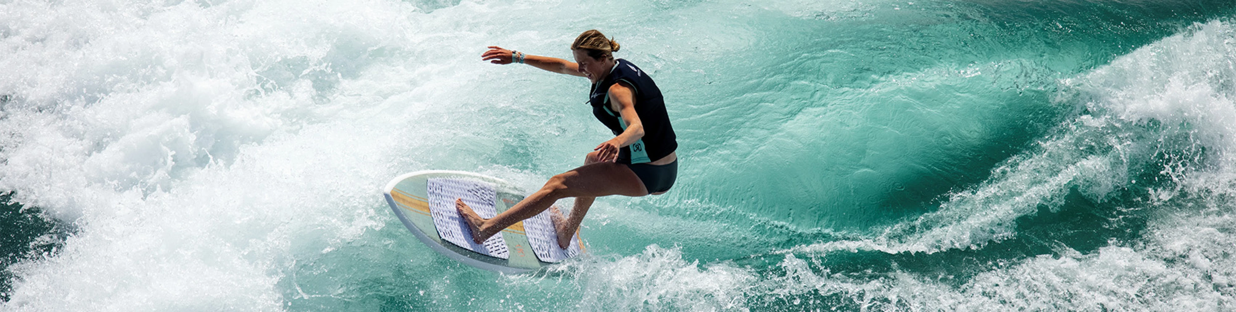 A fast, responsive style of board where the rider’s position is centered with a more balanced body. These sharp rail, thin profiled boards react quicker for people that don’t have a lot of time to waste. Preferred by surfers that like to have more feel with their board itself – and not just on fins. They can break free easier for 360’s on the water or shuvits off it. A more forgiving style of board when riding behind a steep wake because you typically ride this style of board at a shorter length (making it less likely to dunk the nose). Because of how speedy these models are – you can get away with a shorter, lightweight length.